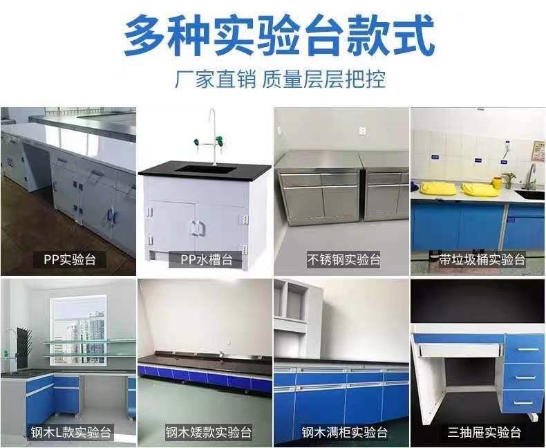 1、鋼木實驗臺廠家采用18mm厚優質三聚氰胺一次成型板,2mm厚防水封邊處理,單門柜及雙門柜內有一層活動棚板,分兩層放置器材等物品。